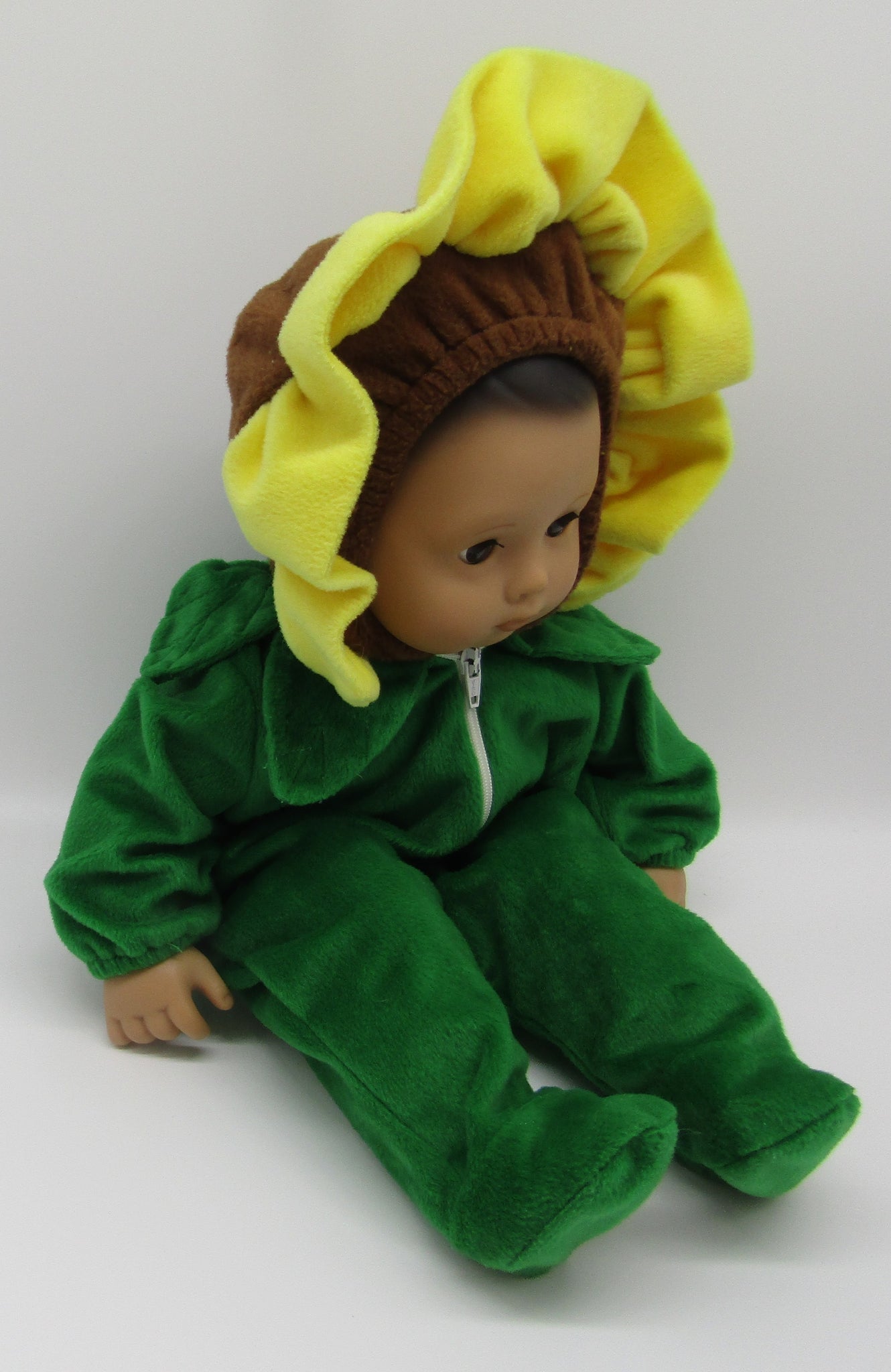 Vintage pre-owned flower costume. This fuzzy costume has a green body, with a flower hood for your 15" Bitty Baby dolls. Imported.