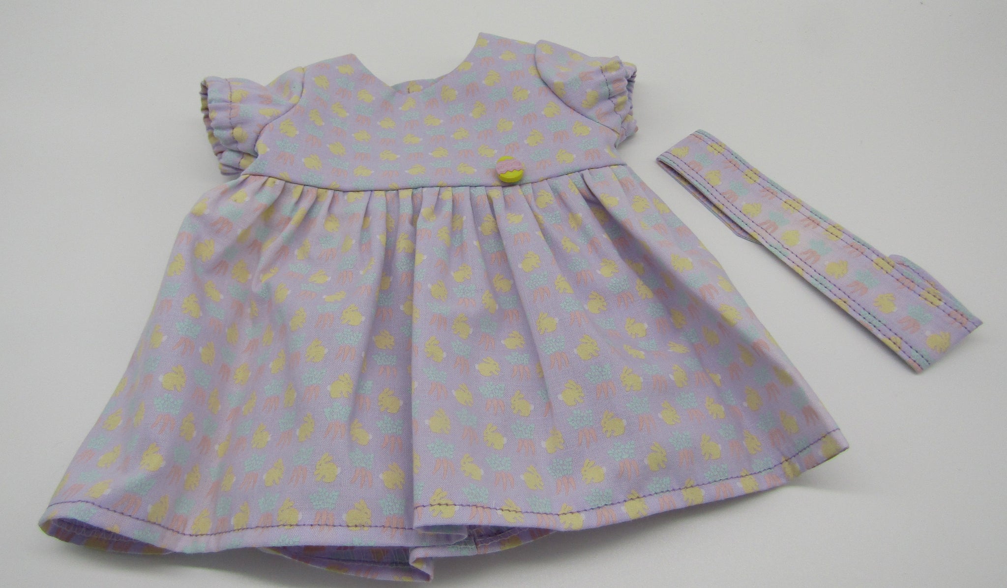 Pastel bunny and carrot-print dress with full skirt, puffy sleeves, Easter egg button accent, & headband for your 15" Bitty Baby style doll. 2 piece set. (Shoes sold separately.)