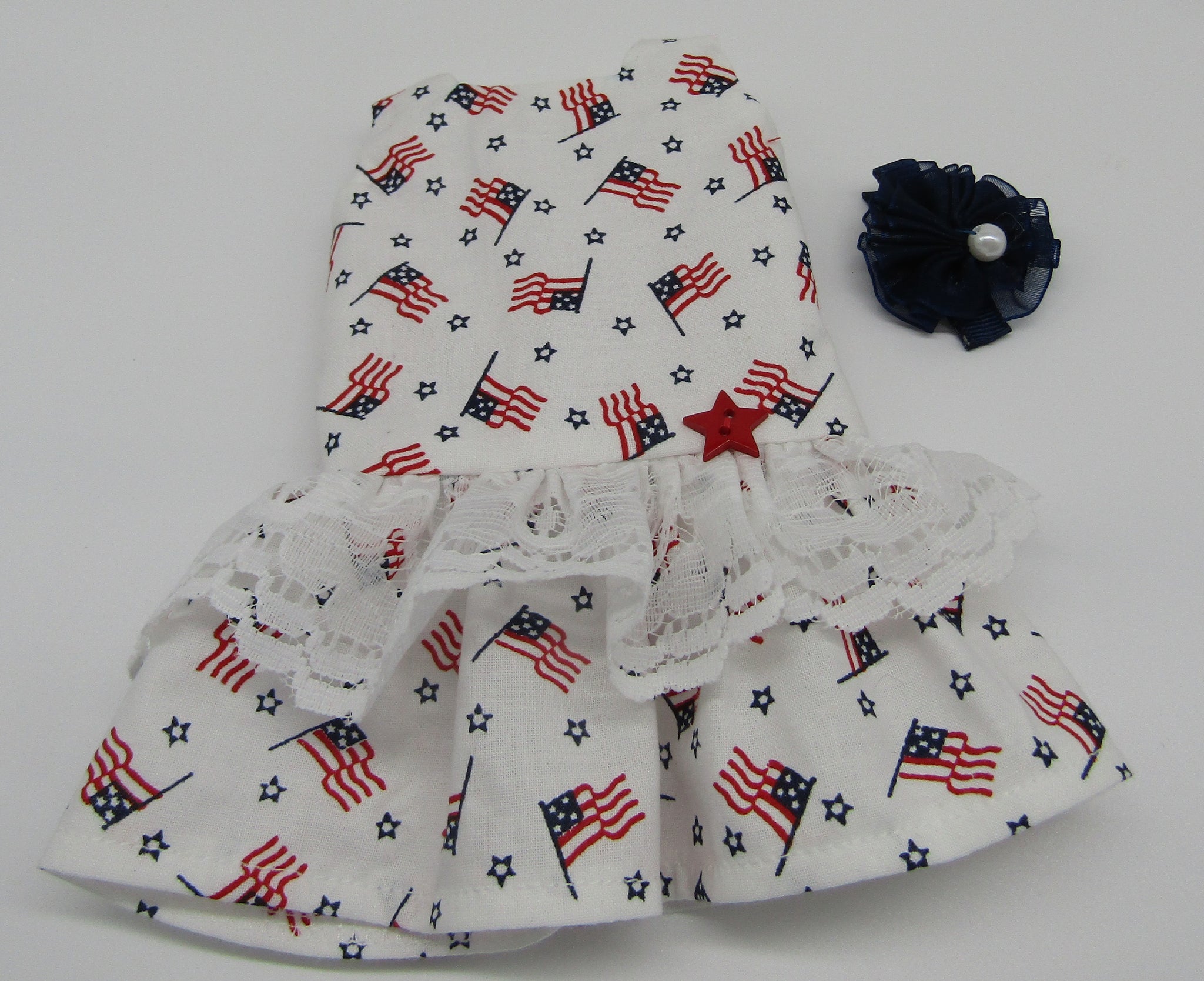 White, red and blue American flag-print, drop waist dress with square neckline, lace ruffle, star button accent & hair accessory for your 14" Wellie Wisher doll. 2 piece set. (Footwear sold separately.)