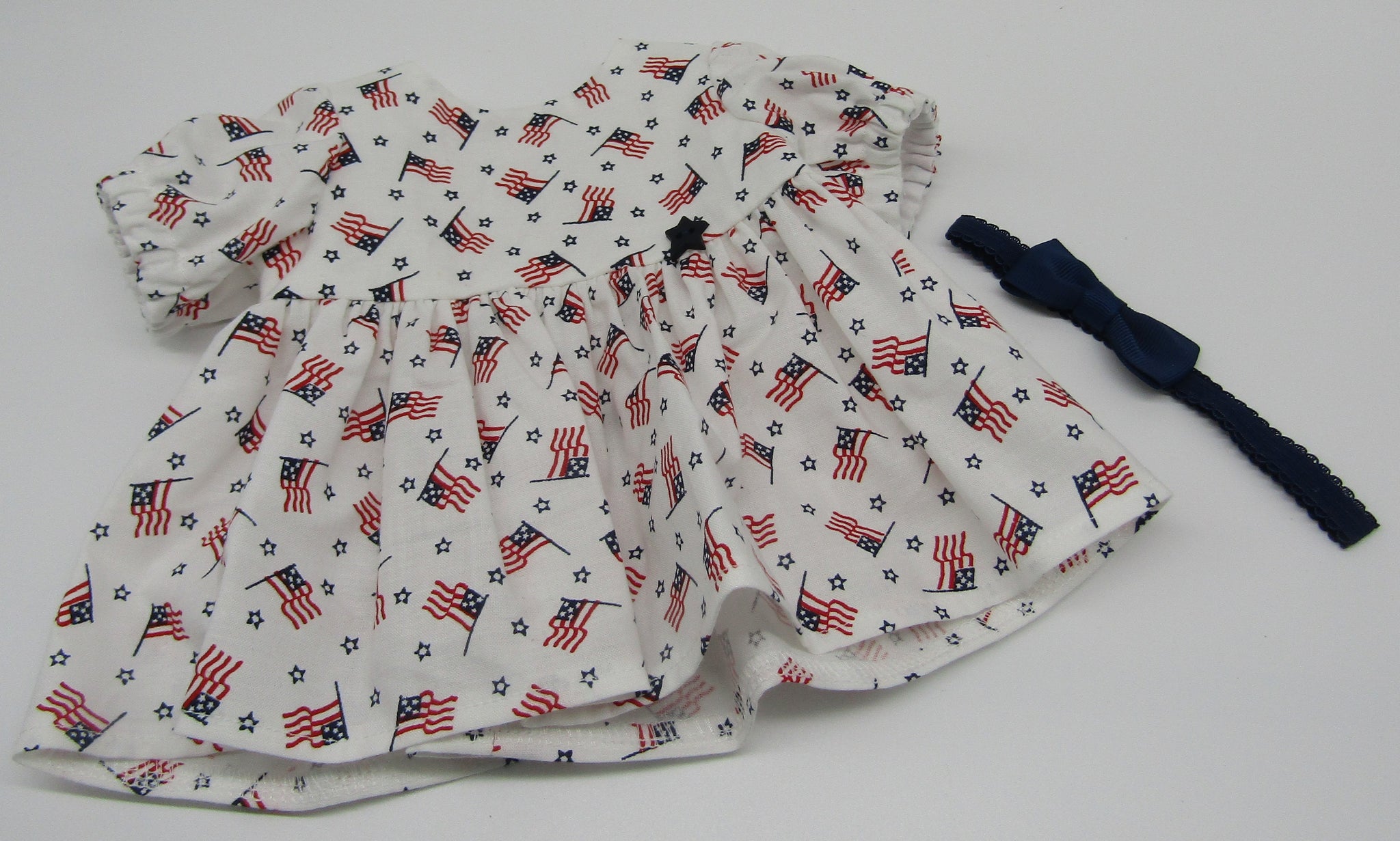 American flag-print dress with short puffy sleeves, gathered skirt, star button accent & headband for your 15" Bitty Baby dolls. 2 piece set. (Shoes sold separately.)
