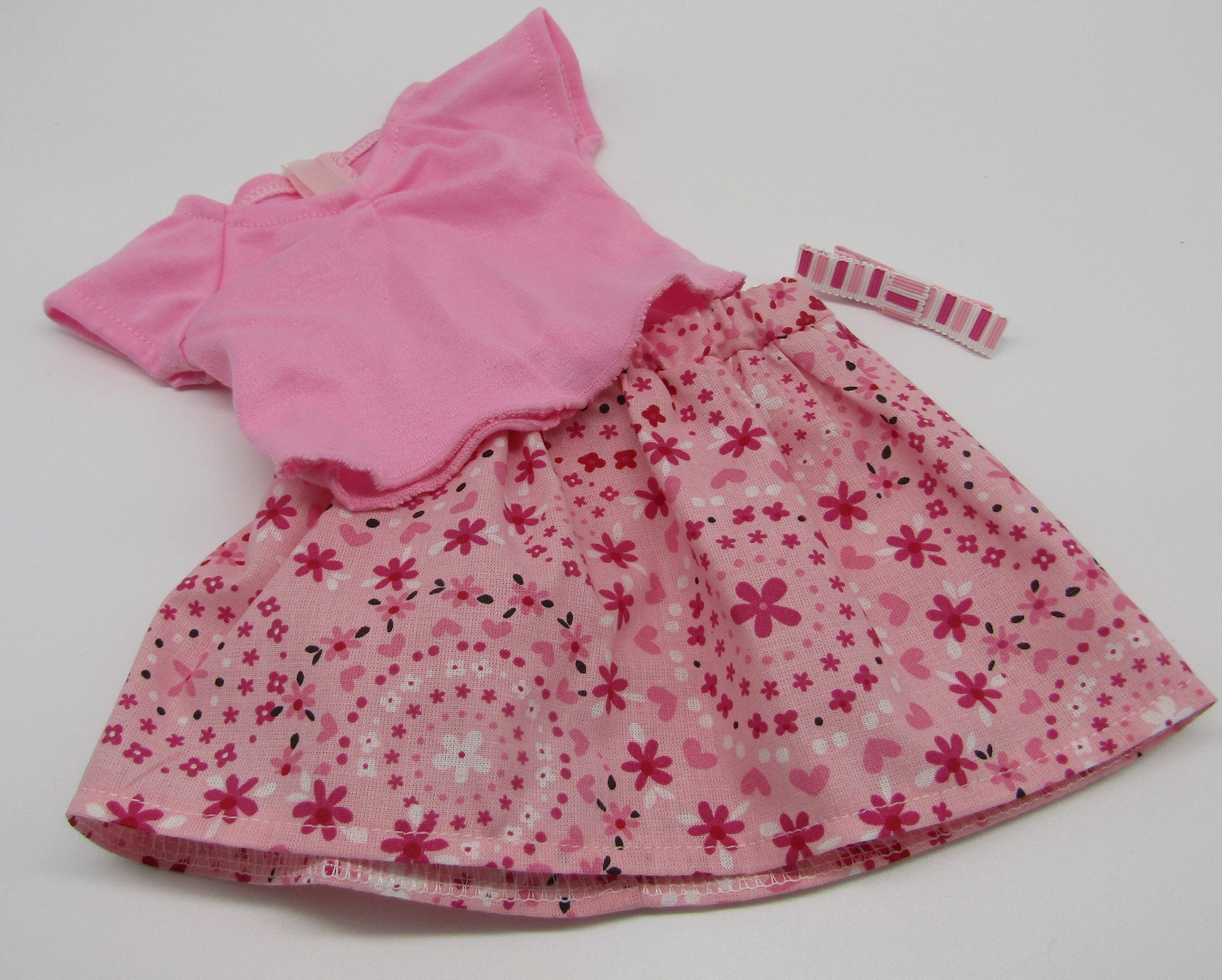 Pink floral skirt with cinched pink T-shirt top & hair accessory for your 18" American Girl style doll. 3 piece set. (Shoes sold separately.) (Top is imported.)