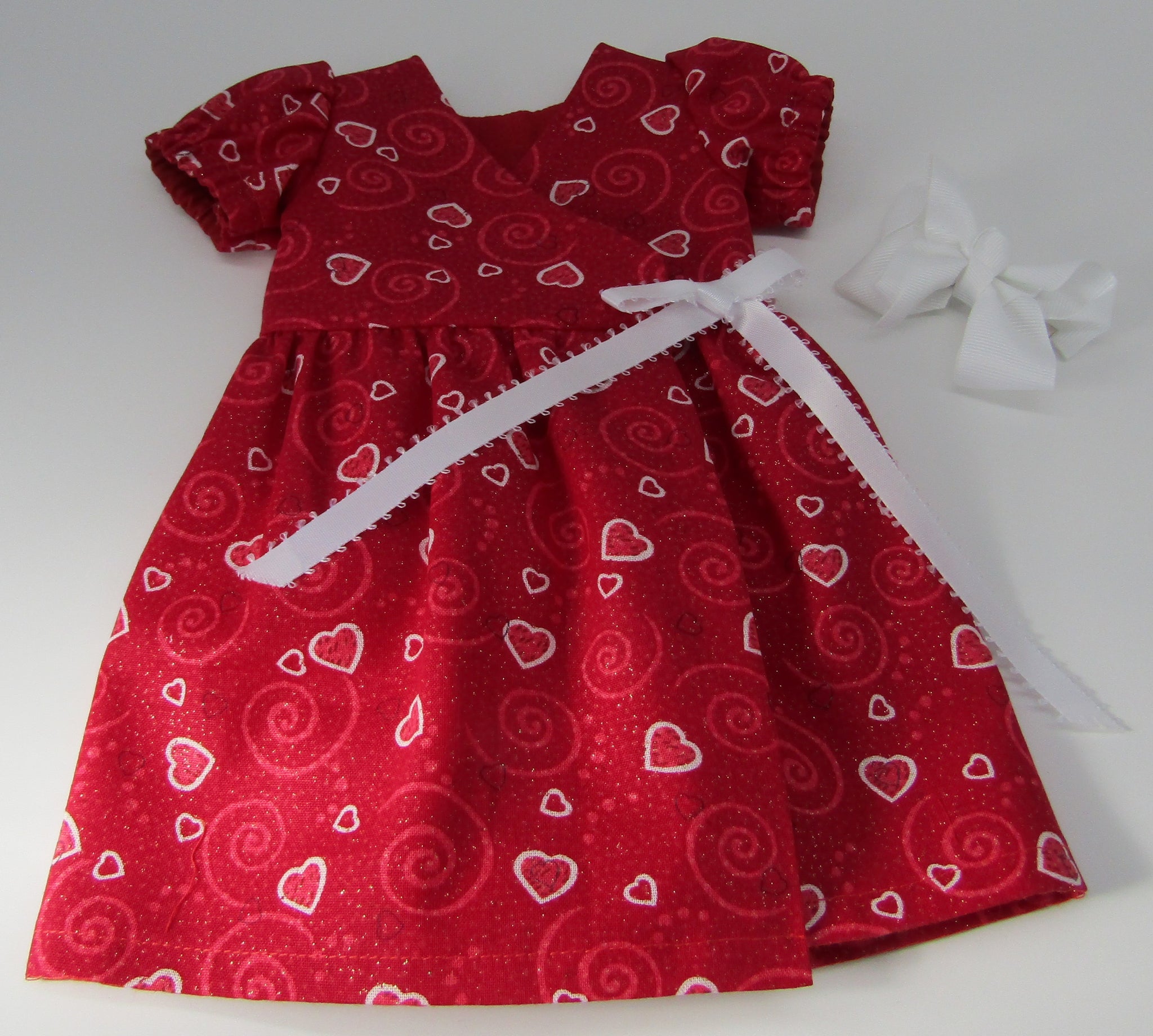 Red & pink glittery heart-print wrap dress with short puffy sleeves, satin ribbon tie & hair accessory for your 18" American Girl style dolls. (Shoes sold separately.) 2 piece set.