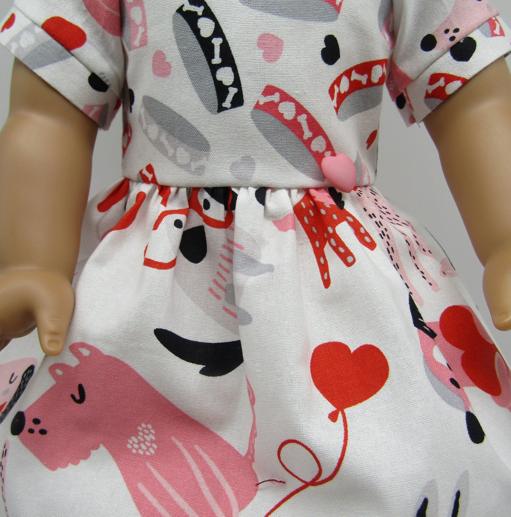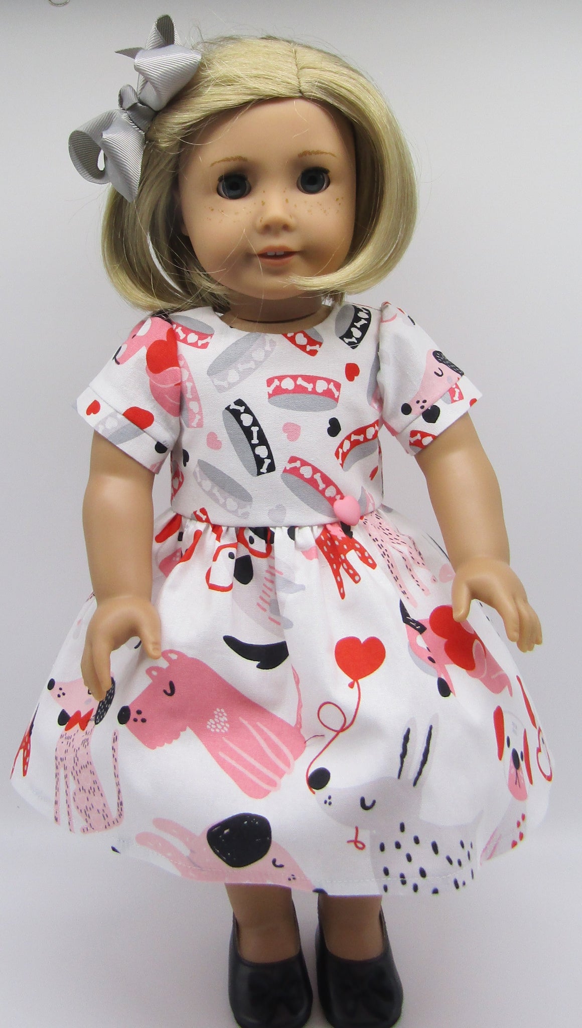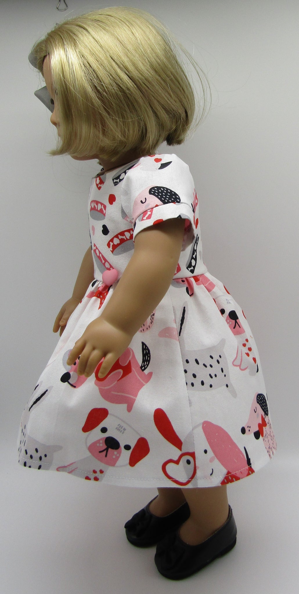 White, pink and red-puppy print dress with full skirt, short banded sleeves, heart button accent & hair accessory for your 18" American Girl style dolls. (Shoes sold separately.) 2 piece set.