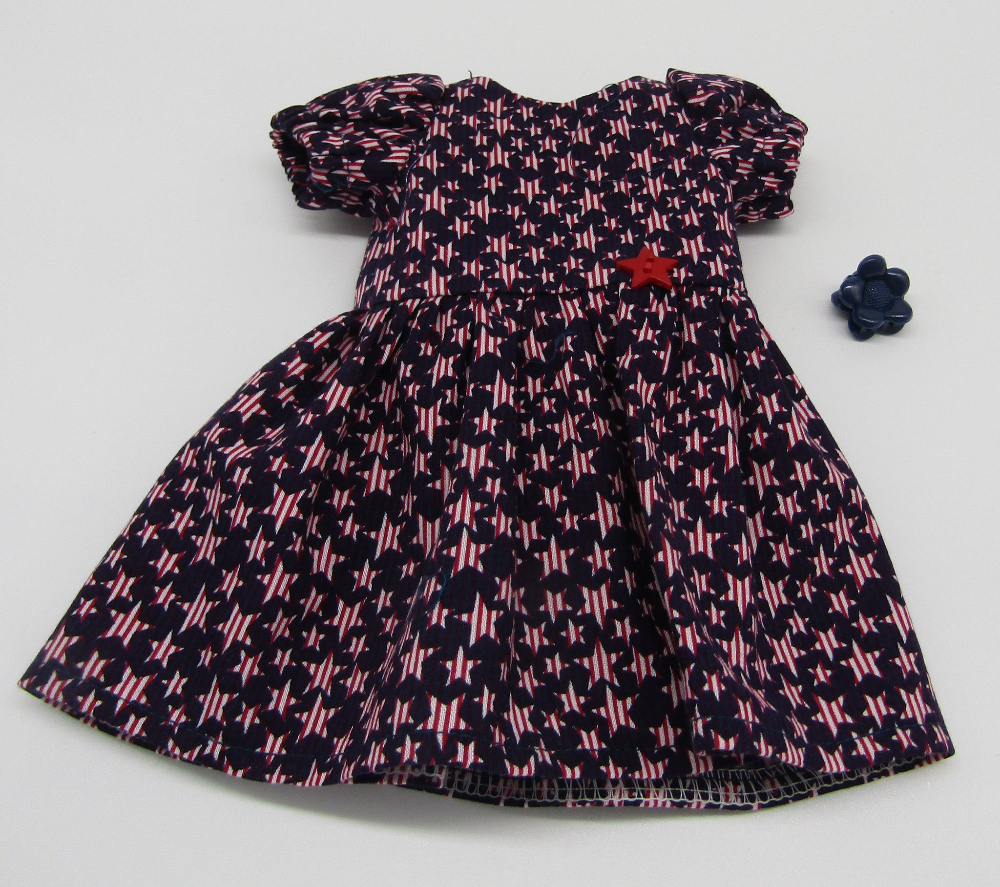 Dark blue patriotic star-print dress with full skirt, puffy sleeves, red star button accent & hair accessory fit for 14" Wellie Wisher doll. 2 piece set. (Shoes sold separately.)