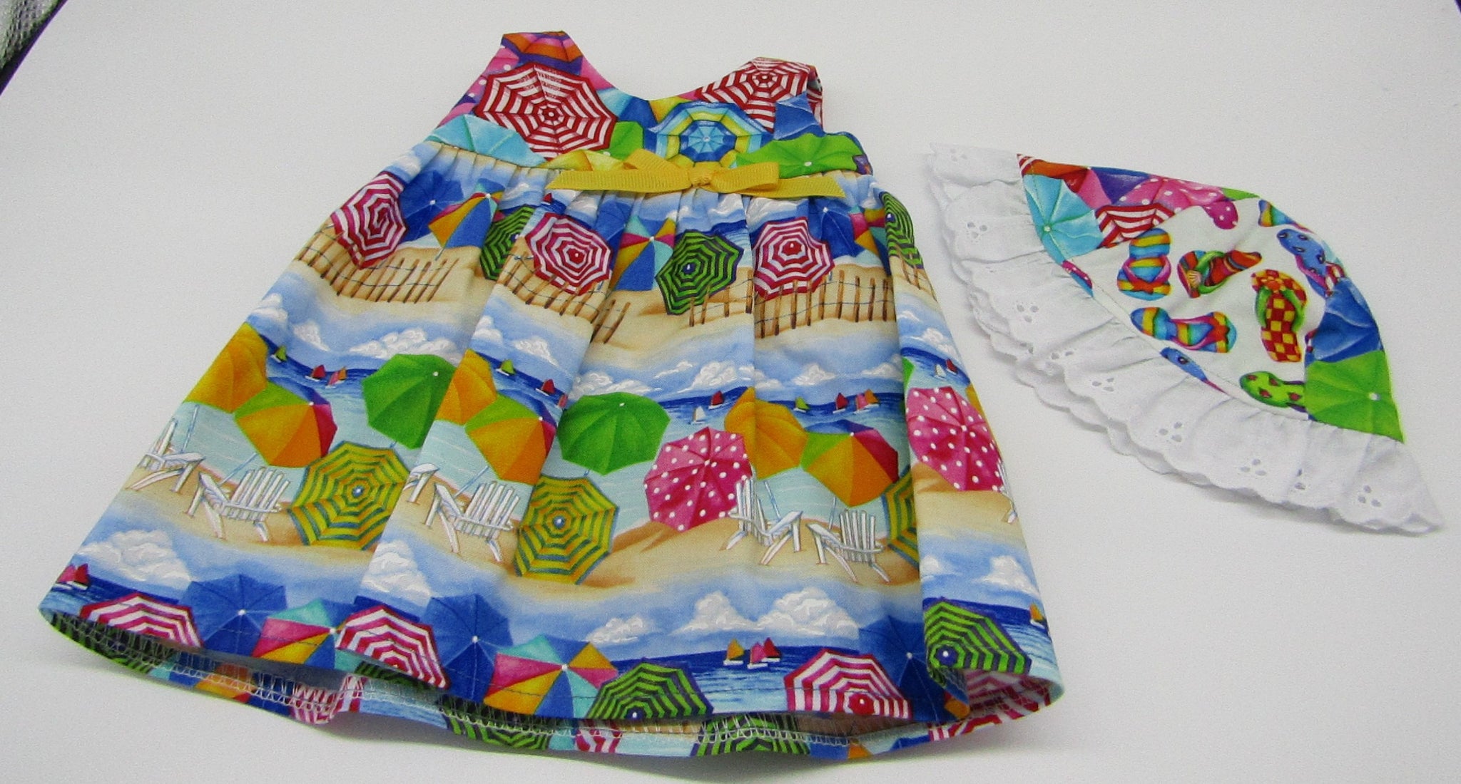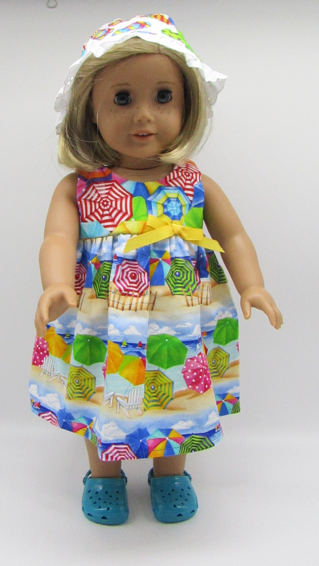Beach umbrella border-print sleeveless dress with raised waistline, gathered skirt, ribbon bow accent & eyelet trimmed sunhat for your 18" American Girl style dolls. 2 piece set. (Footwear sold separately.)