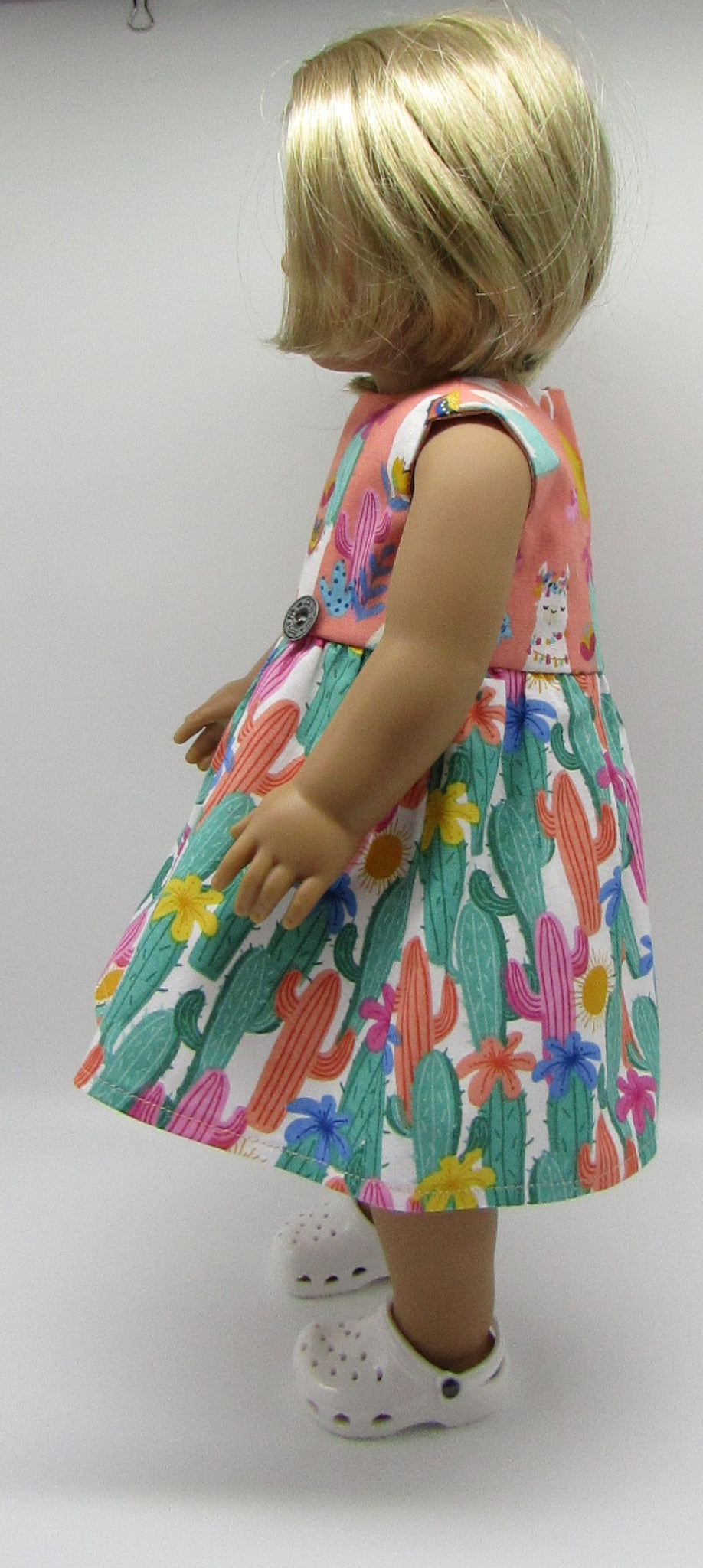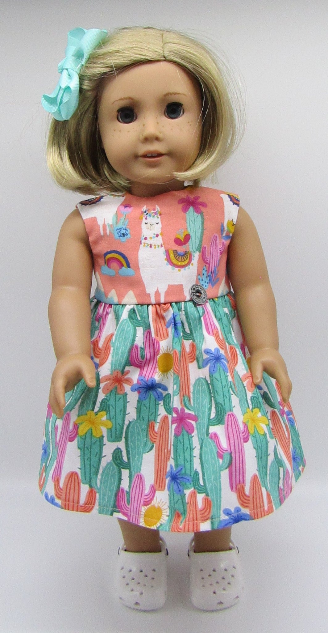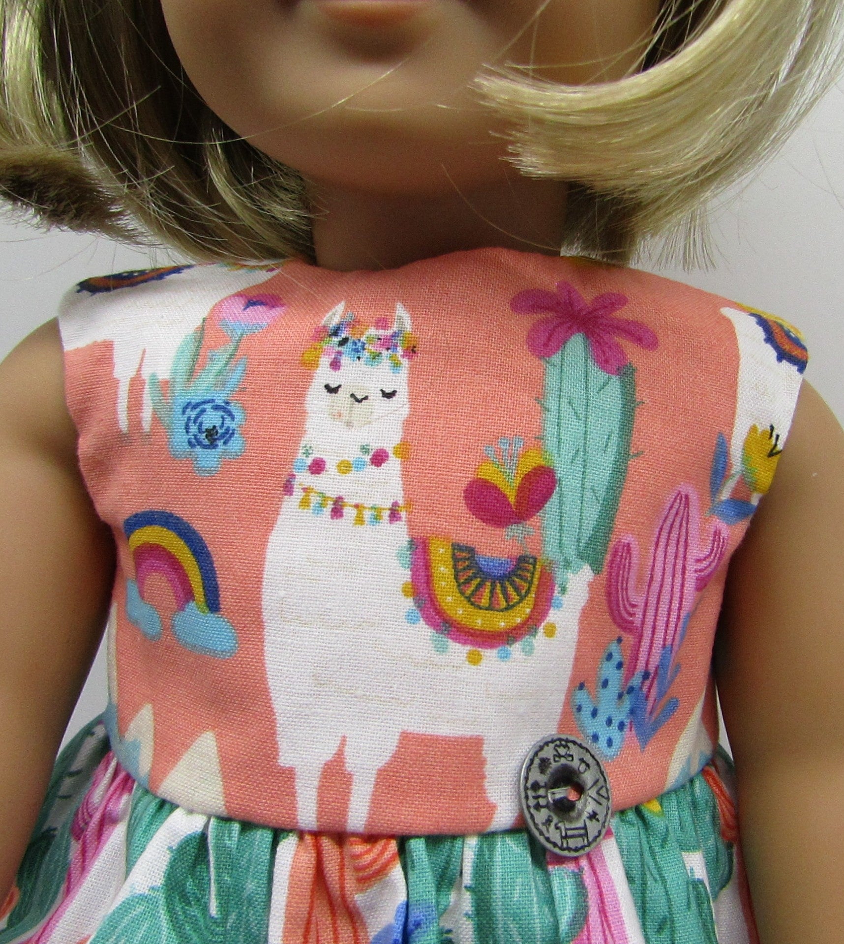 Celebrate the Southwest with this peach and teal llama and cactus print sleeveless dress with full shirt, metal etched button accent & hairbow for your 18" American Girl style dolls. 2 piece set. (Footwear sold separately.)
