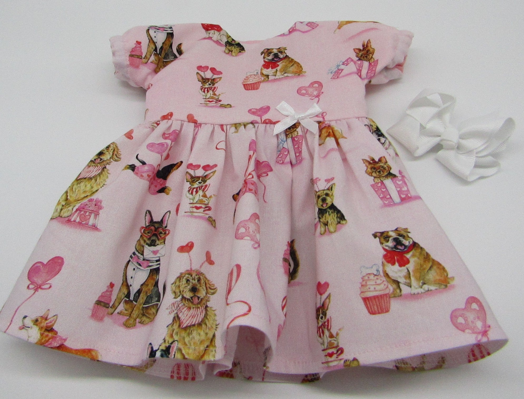 Pink Valentine-puppy print dress with full skirt, short puffy sleeves, satin ribbon bow accent & hair accessory for your 18" American Girl style dolls. (Shoes sold separately.) 2 piece set.
